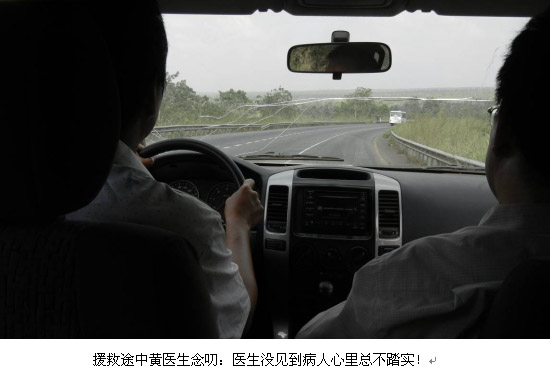 救援方案确定后,中国医疗队黄志坚队长提前草草吃了午饭,带上手术器械和药品,乘上四0三地质队的小车,与勘探组队员一起,从弗里敦向马声谷营地方向急驰而来;在马声谷营地,一辆工程车载着一行四人,则向弗里敦方向奔去。车上除司机和重危病员外,还有两名队员,一人带上卫星电话,负责通讯联系,另一人20年前曾在部队当过卫生员的,也临时肩负起途中的急救任务。一场与死神赛跑,救援队友的生命接力就此拉开!