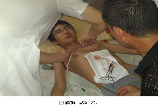 在没有理想环境和严格消毒条件的情况下,只能因陋就简!经过迅速的术前准备,黄医生主刀、勘探组医生当助手,对病人进行了胸部局麻、切口、插管、排气手术。在危急的气氛中、酷热的空气里,黄医生头上流下的汗水把眼镜镜片都浸花了,助手给他擦了一遍又一遍。不到一个小时,手术取得了成功!