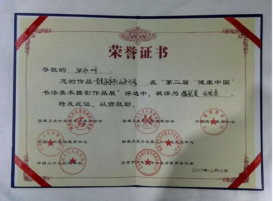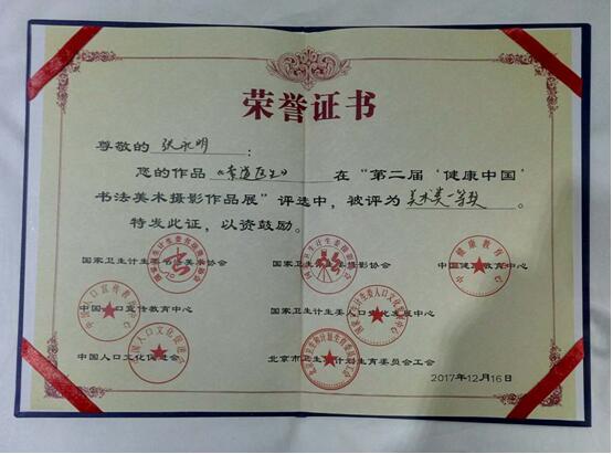 为大力推进“健康中国”建设,全方位倡导大健康理念,庆祝党的十九大胜利召开,由国家卫生计生委书法美术协会、国家卫生计生委摄影协会、中国健康教育中心、中国人口宣传教育中心、人口文化发展中心、中国人口文化发展促进会,中国家庭报社承办的“第二届‘健康中国’书法美术摄影作品展”于2017年12月16日—17日在北京国际会议中心隆重举办。我院门诊办支部书记张永明的美术作品国画《索道医生》荣获一等奖、摄影作品《党员医疗队深入山区义诊》荣获优秀奖,这是张永明继去年在省卫计委工会举办的书法、美术、摄影获双奖后又一次飞跃。