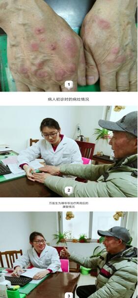 11月9日这天我来到中心医院门诊皮肤科见到一位很年轻的女医生,认为年轻医生经验不足、见识不多,顿时我求医的心跌至谷底,然而这位医生却出乎意料之外,她随即叫我伸出双手仔细观察病灶、认真诊治并用手机拍了个发病的病灶,胸有成竹的诊断我的病为“多形红斑”,并告知了该病的后果严重性。经她精心的治疗及第二次复诊使用的内服、外用药一星期多基本控制了病情,两周后彻底痊愈。幸运这次遇上了年轻有为的万医生,才使我脱离了疾病的折磨和痛苦。